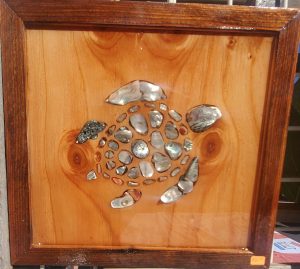 I also have several boxes of wild life art blanks for the abalone art. Turtles, butterflies and humming birds are popular. I have elk, moose and fish as well. Theses are started from repurposed wood. I took an old desk apart and cut it into 8 inch by 24 inch pieces and 10 by 26 inch pieces. I recycled the rest of the desk wood and am making 11 larger fish pieces with a old used free, repurposed desk. I also buy slabs of redwood, walnut, willow woods and for art as well.